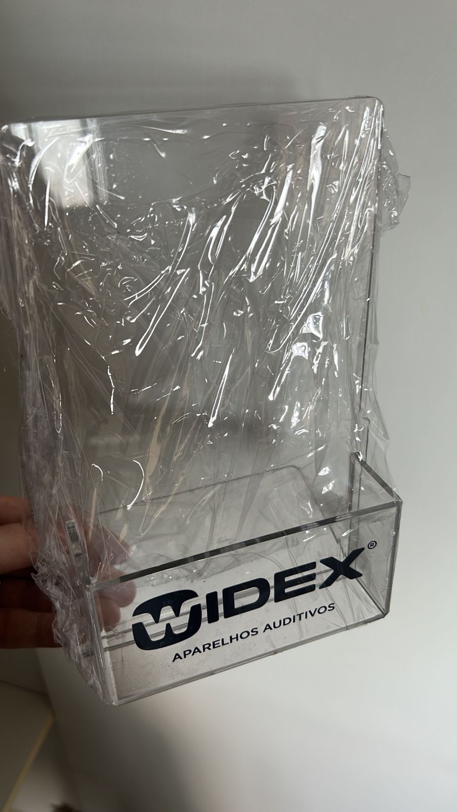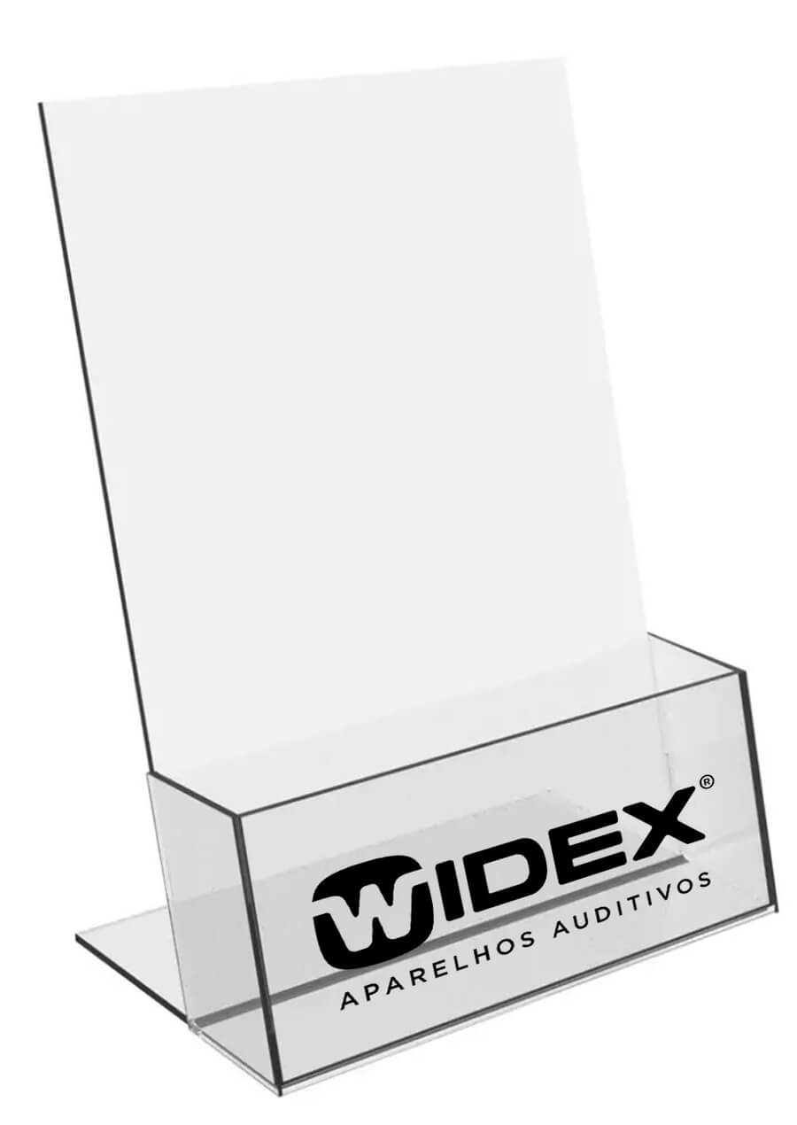 Display para colocar folders impressos da marca Widex. Evite colocar folders diferentes em um mesmo Display para que o paciente possa ver todos os folders disponíveis.