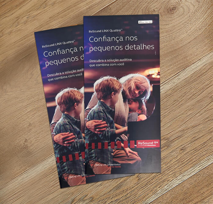 Folder “Confiança nos pequenos detalhes” é um folder que deve ser usado pelos(as) fonoaudiólogos(as) para apresentarem a os aparelhos GN LiNX Quattro. Podem ser entregues para pacientes em teste.